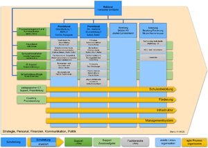 Unser Organigramm vereint Stabilität und Agilität in idealer Art und Weise. Die stabile Abteilungsstruktur sichert die optimale Qualität der Ausbildung unserer Lernenden. Die vier Prozesse Schulentwicklung, Förderung, Infrastruktur und Managementsystem ermöglichen durch stetige Thematisierung in den entsprechenden Gremien eine agile Führung und die kontinuierliche Weiterentwicklung unserer Schule. Die Supportstellen stellen stabile Arbeitsbedingungen und eine zielgerichtete Unterstützung und Beratung der Linienorganisation oder in den Entwicklungsprozessen sicher.